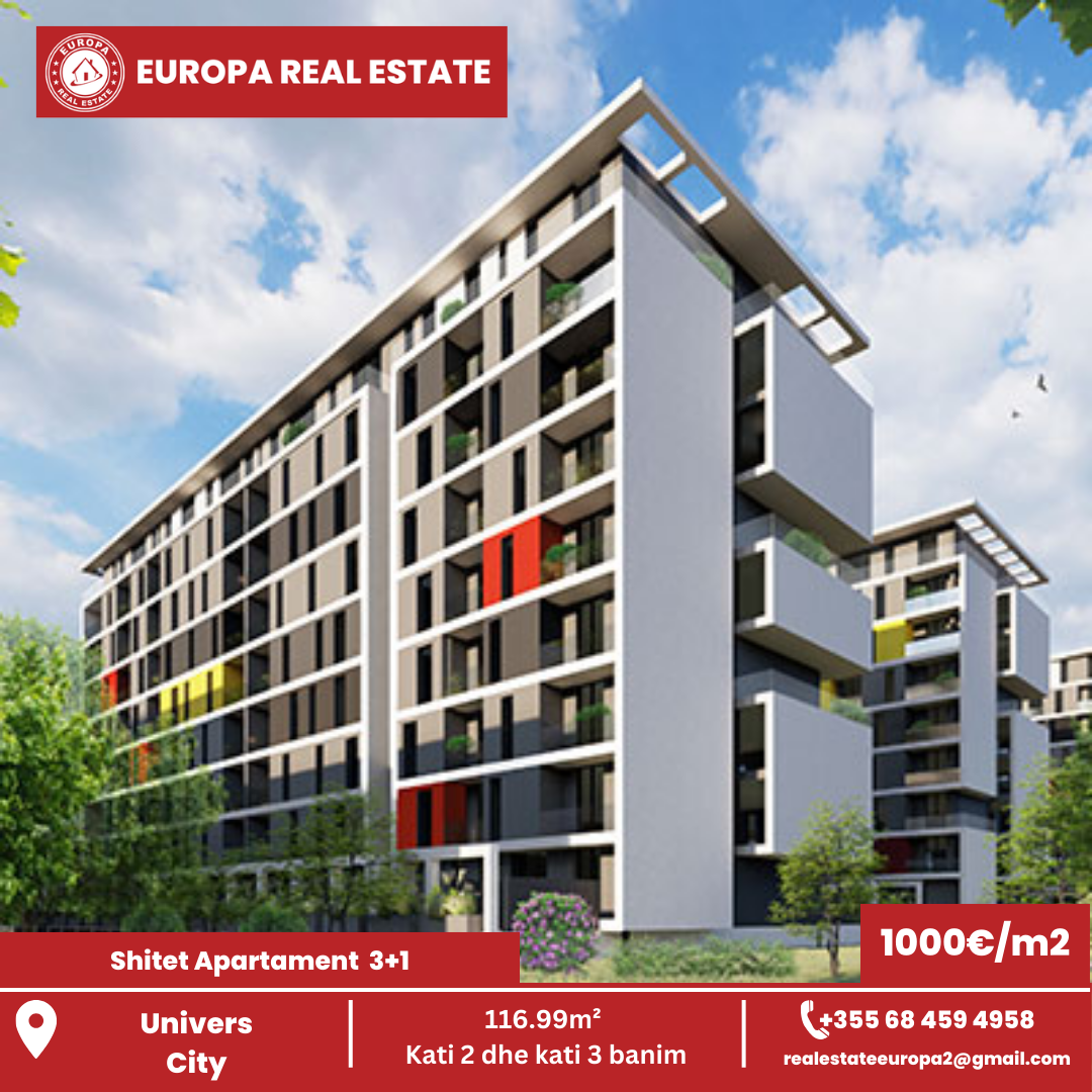 Ne kompleksin modern Univers City shiten apartamente tipologjia 3+1 , me siperfaqe 116.99m2, te pozicionuara ne katin e 2-te dhe te 3-te banimi. Apartamentet ofrojne hapesira te bollshme, organizim funksional dhe ndricim natyral , duke i bere ideale per banim familjar ose investim.